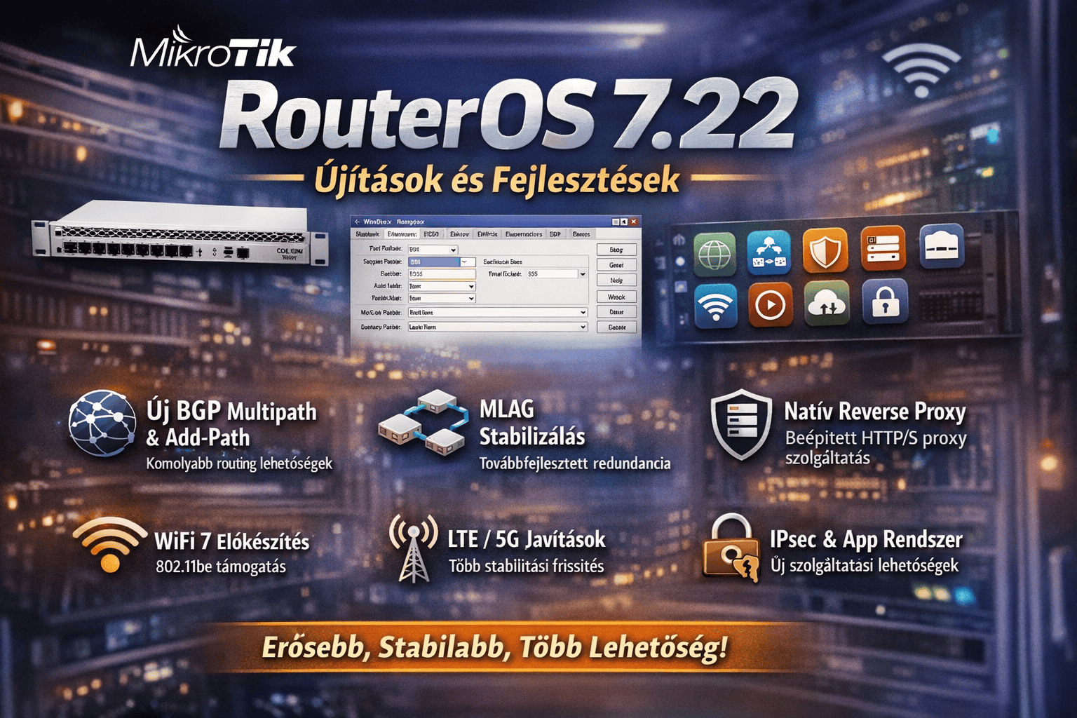 A 7.22-es RouterOS nem egy „szokásos” kisebb frissítés. A béta1-től az rc2-ig végignézve a changelogot látszik, hogy itt több nagyobb irányváltás is történik: komoly BGP fejlesztések, MLAG stabilizálás, új App rendszer, reverse proxy natívan, WiFi 7 előkészítés, és rengeteg LTE javítás.