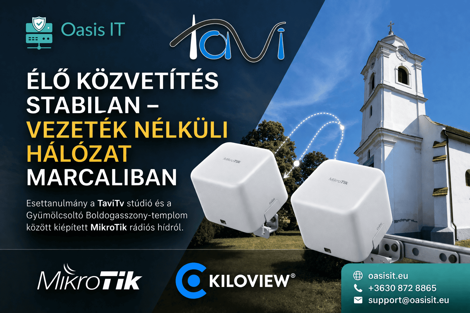 A feladat az volt, hogy a TaviTv stúdióját össze kellett kötni a Marcali Gyümölcsoltó Boldogasszony-templommal, mégpedig úgy, hogy alkalmas legyen élő közvetítésre. Ez elsőre nem hangzik extrának, de a helyszíni adottságok hamar megadták a projekt valódi nehézségét.